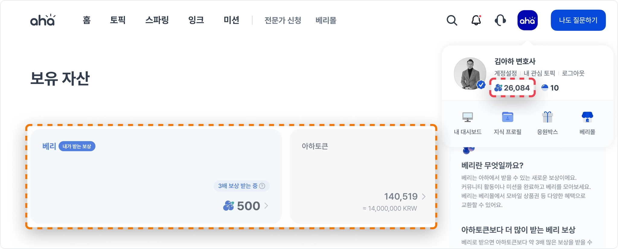 커뮤니티 활동으로 모은 베리를 아하 베리몰에서 쿠폰으로 교환할 수 있어요.