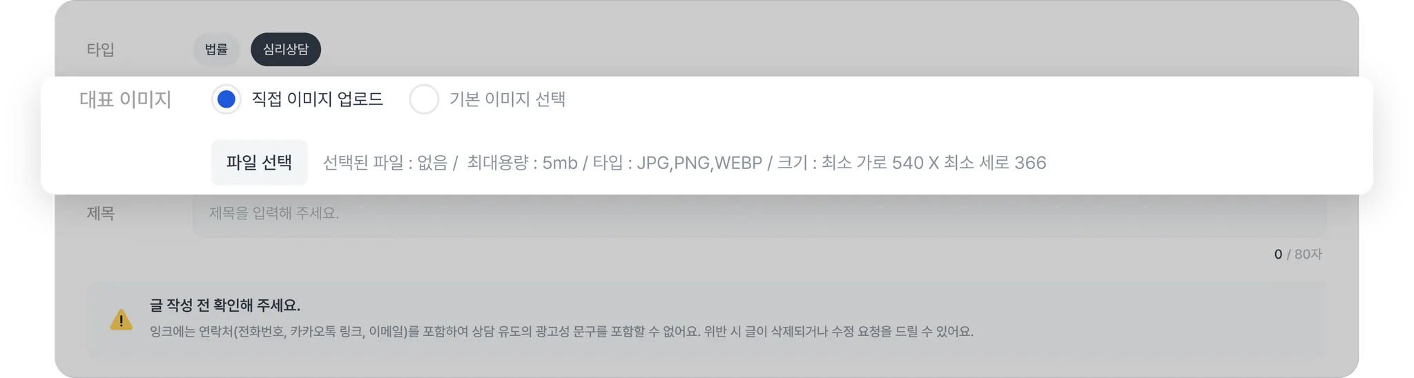 직접 업로드할 이미지가 없으신 경우, 기본 이미지 선택을 눌러 제공되는 이미지 중 하나를 선택해 주세요.
