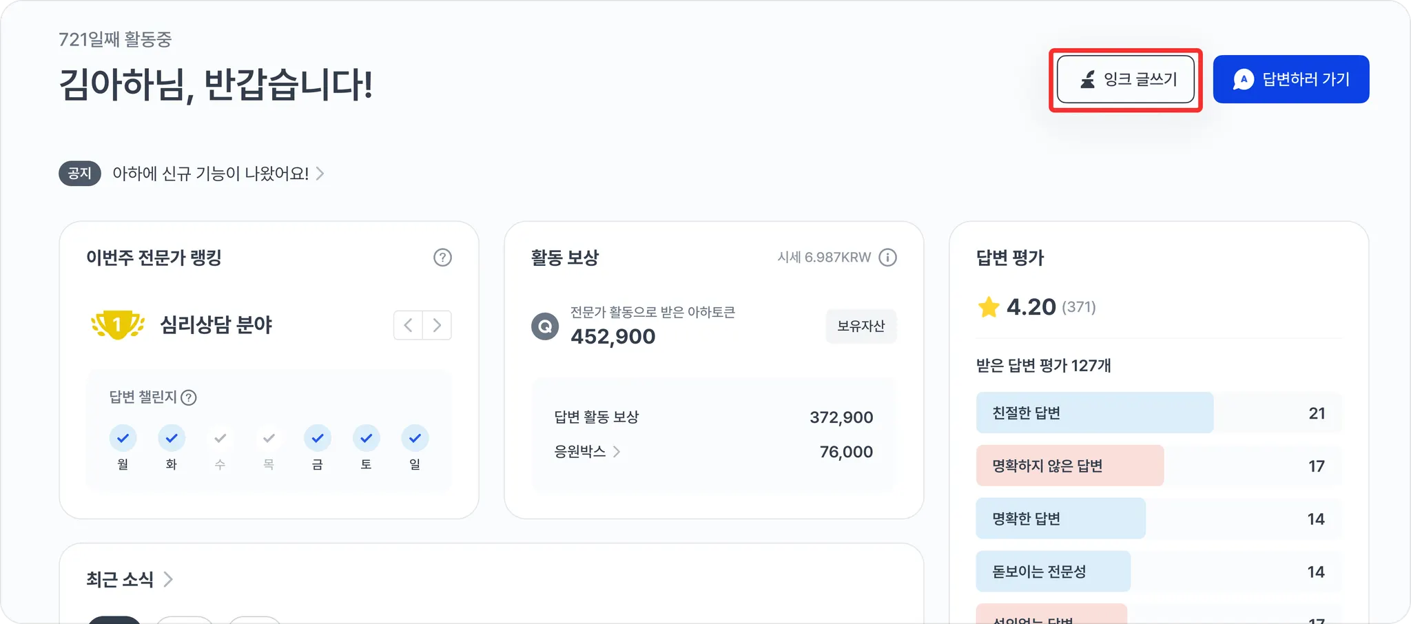 대시보드 투데이 하단에 잉크 현황 카드를 클릭하거나, 상단의 전문가 활동을 클릭해서 나의 잉크 목록을 확인할 수 있어요.