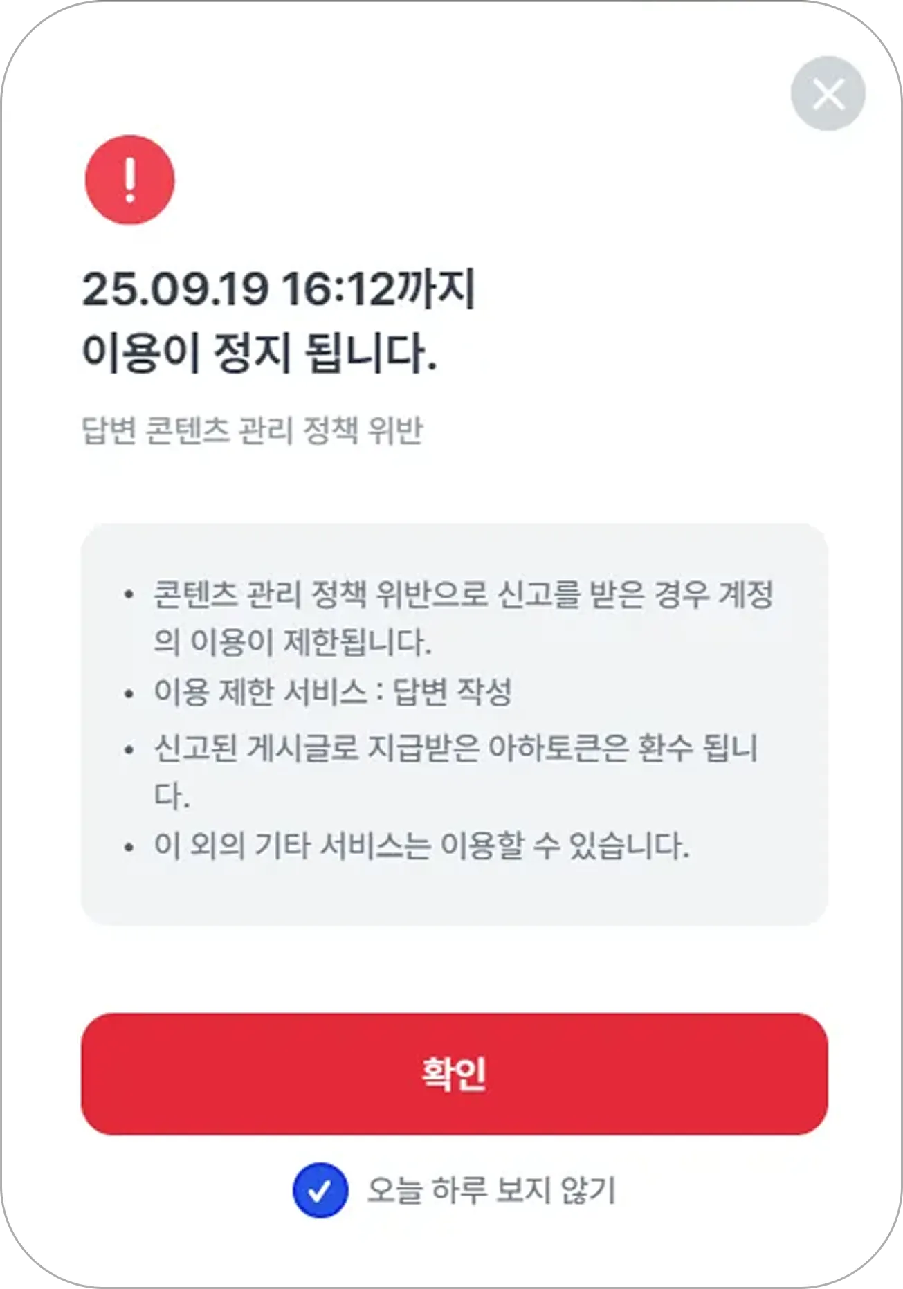 답변 승인 누적 횟수에 따라 답변 정지 기간이 늘어납니다.