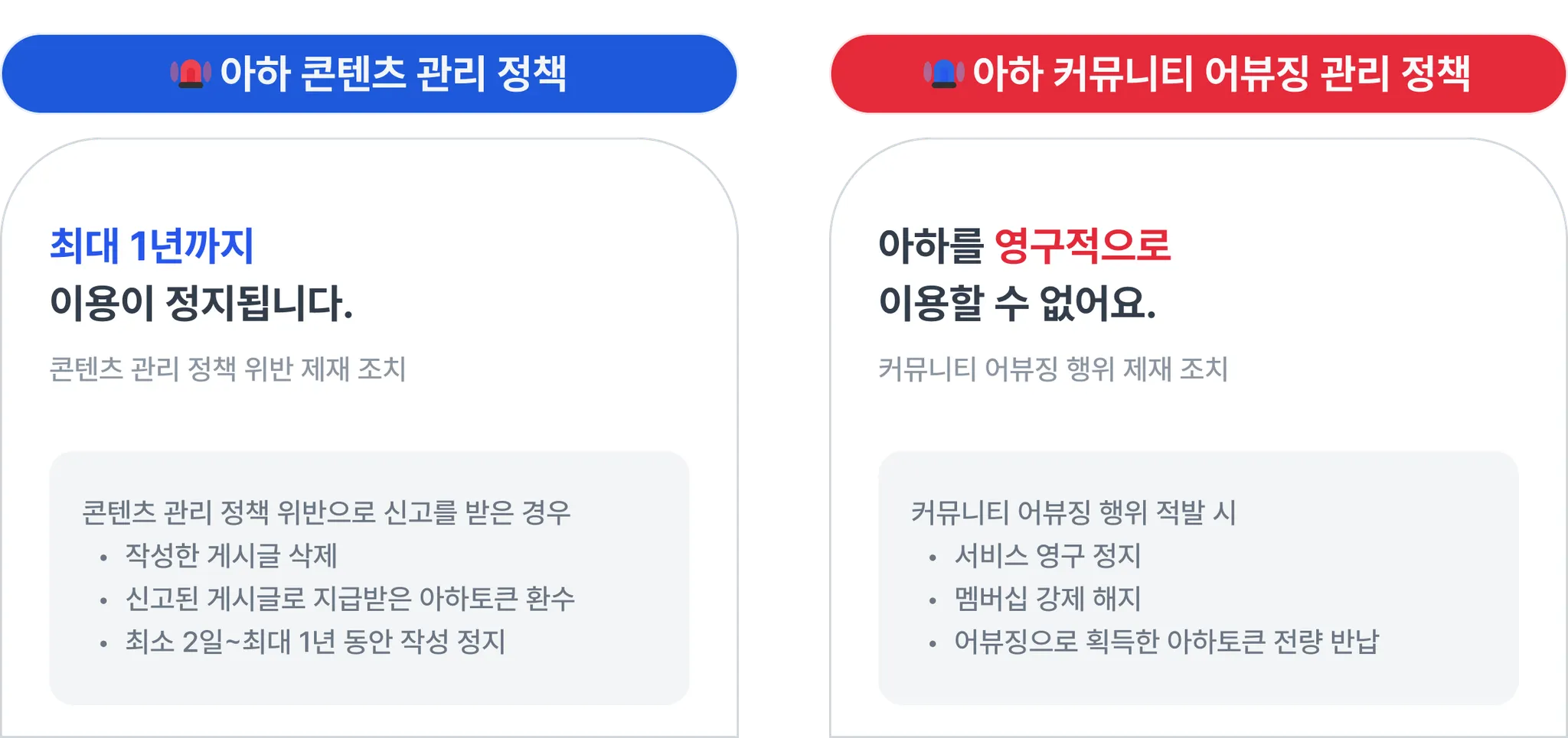 아하 커뮤니티는 원활한 운영과 더불어 커뮤니티 회원들이 안전하고 공평하게 활동할 수 있도록 콘텐츠 관리 정책과 어뷰징 관리 정책을 운영하고 있어요.